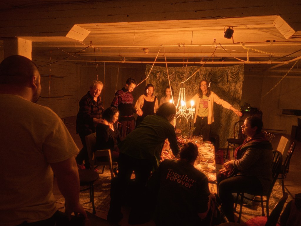 Un banquet participatif, à la fois formel et convivial, lors duquel une voix amicale donnait le rythme et des indications surprenante. Au fil du dégarnissement de la table, le dévoilement des sensibilités, croyances et convictions des artistes s’effectue. Puis, les participants sont invité.e.s à nous partager une étincelle d’eux/elles-mêmes.